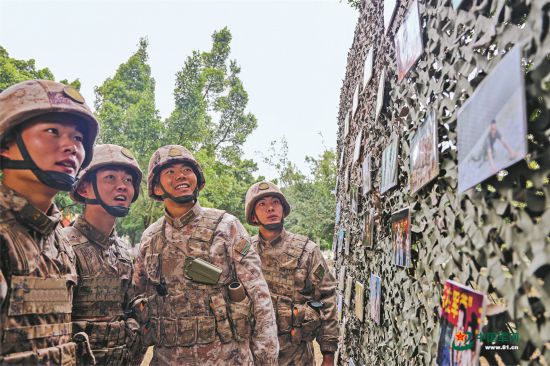 结束一天的训练,连长申世杰(右二)和战士们围在“战地风采墙”前分享照片背后的故事。唐浩熠摄 暮色四合,第77集团军某旅“战斗模范连”官兵结束了一天紧张的战术训练,三三两两走向营区一角。