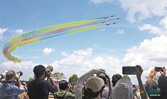 2月3日,中国空军八一飞行表演队在第十届新加坡航展首日进行飞行表演。 新华社发 海风拂动狮城,战鹰亮翅碧空。