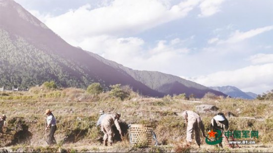 露水打濕迷彩褲,戰士們全然不顧,張天德手把手教年輕戰友分秧插秧。阿嘎次姆撐著拐杖坐在田埂上,看著忙碌的身影淚光閃爍,不時遞上酥油茶。