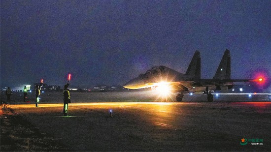 夕陽映照,機場披上一層霞光。跑道上再次響起震耳的轟鳴聲,戰機滑向起飛線,加力升空。天光漸暗,飛行員全神貫注緊盯儀表,在低能見度條件下開展戰術機動、模擬攻擊等課目訓練。指揮員臨機導調“敵情”,錘煉部隊夜間快速研判、果斷處置能力……
