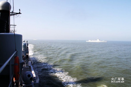 参加中俄“海上联合-2014”军事演习的中俄舰艇抵达演习海域。 刘鹏摄